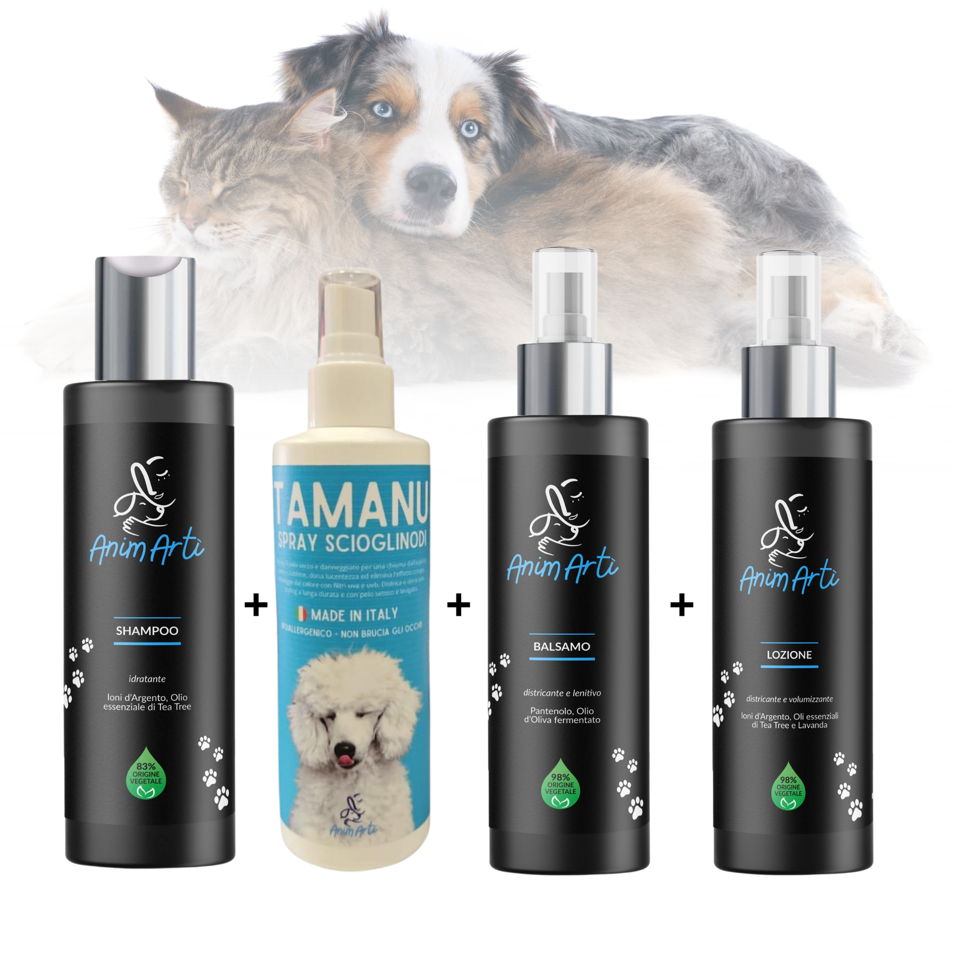 Il Kit Luxury Nuvola di Seta rappresenta l’esperienza più completa della linea AnimArtì, unendo Shampoo Idratante, Balsamo Spray Districante, Tamanu Spray Scioglinodi e Spray Tea Tree & Lavanda. Una sinergia studiata per detergere delicatamente, nutrire e proteggere la cute, districare il manto e donare una sensazione di freschezza e comfort prolungato.